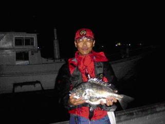 場所替えしようと思ってたところだったが、思わず引き返し、White先生の落としこむ姿を遠くから眺めちょっと研究。お勧めのポイントを譲ってもらい、一生懸命落としていると、明らかに『止まり』のあたり。すかさず聞いて見ると、なんとそのままス〜ット上がって来る。ウン?ゴミでも釣ったか?と水面を見ると魚である。