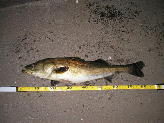 | ここ10月になってから福浦界隈はクロ&釣り人の活性も高い。(浮き部) そんな中私はというと・・・目標の10枚は達成できたが40cm後半が釣れない。 「まっいいか!」と思うこの頃だが大物が釣れないのは名残惜しい。 それもOLM以降何回バラしたことやら・・・6回?覚えられないほどである。 でもツキはあるようだ。OMLではDVDプレーヤーGETしたし。ただ魚が掛かってもバラシてしまうのが下手な証拠である。 現に、今日はダブルありさんが35cmを釣っている。今日は釣れないかな?と思いながらの浮気釣りである。 そんな中で泳がせ釣りをしようと思った前段がある 先週の金曜日のこと。 夕方から始めて、子メバを釣り、足もとに放流すると・・・なにやら「ガバッ」と水面に出てくる。 3尾個ほどリリースしたがいつれも水面に出てくるやつがいた。 「これは!」と思いチヌをあきらめて先ほど釣れたアジをチヌの仕掛けそのまんま(ハリスは1,25)足元落としたら・・・アジが「スーーー」と持っていかれる。 「やった!」と思いきや少し竿を仰いだら「スポッ」とスッポ抜け。 あれー???あわせが早かった?と思いもういちとアジを入れた。 またそれに食いついて、今度はよく飲み込ませて1分ぐらい糸を送り込んであわせたらやっと乗った! でも乗ったと思い格闘1分、ハリス1.25ではあっという間にジ・エンド。 また翌日の土曜日リベンジ・・・と思いきや、子メバをGetできたので再トライである。 実はその前に師匠が子メバにススキ君がかかったのを見て「今日もいる!」と思いきや直ぐに仕掛けチェンジ。 昨日はハリス切れなので今度はハリス2号で2本針でトライ。 足元に投入して、30秒ぐらいで掛かった。 今度もよく飲ませてからアワセ。乗った! 「師匠。タモお願いしますーーー」と呼び師匠がタモ入れ使用とした瞬間、「プチッ!」 とむなしくハリス切れ。「ちくしょーーーー」と思ったのは後の祭りである。 「逃がした魚は大きい」という事はまさにこの事である。 で3度目の正直で「今度は釣りぞ!」と意気込みで、夕方から子メバを3匹ほどキープしてそれ以降はリリース。 そうするとまたまた水面に出てくるではありませんか。 「よし!今日もいるどーーー」と思い、気合を入れて仕掛け作り。 今日は道糸と同じはハリス2.5号で再リベンジ。 と、思いきや浮きを流しても全然掛かってこない。「あれ?何処かいっちゃたかな?」と思い30分ほどやってみたがダメである。 これ以上やってもしょうがなさそうなので、足元に置竿にしてチヌ釣り再開。 それから2時間ほどたって師匠にコーヒー入れようとお湯を沸かしてたら、竿が「ガガガーー」と持っていかれた。 「師匠!また掛かった!」と呼び魚とやり取りしている。右に行ったり、左にいったり。 最近は大ボラ様のおかげで結構大物とのやリ取りには余裕がある、糸を出したり、巻いたりと繰り返している。 でも中々師匠が着てくれない。「師匠!!!」っと呼んでも「待って〜」との返事。 「師匠早く〜」「またバラしちゃうよ〜」と思っていたら、師匠はゴンズイが掛かっていたらしくそれを外し中。 (「師匠ゴンズイなんて後で外せばいいじゃん」)と思いきややっと水面に浮かせてから1分ほどで着てくれました。 それで何とかタモ入れ完了。 福浦で1度フッコを釣りたいと内心思っていた所、念願かなってあげてみたら83cm 4kgのスズキさんでした。(20:40) その後師匠に血抜きして頂きました。(師匠ありがとうございます) それから、師匠にコーヒーを渡し後、師匠は1枚GET。お見事です。 ・・・以上、スズキさん・・・のお話です。 番外編 その後、深夜0:00ごろ?念願の本命が掛かって師匠にタモ入れをお願いしたのだが・・・ 今度は、ソイと格闘中。「師匠!なんで〜〜〜早くお願いしますよ〜」と言っている間魚は水面に浮いてきている。 やっと師匠が駆けつけてきてくれた途端・・・ハリ外れ。 「あ〜〜〜」と浮きは宙を舞いました。 ここ最近師匠にタモ入れお願いするとバラシばっか。これで4度目。 なんて下手なんだ。自分に嫌気がさす。 でもその前に自分でタモ入れしなきゃいかんのか(爆) そんな落胆して本日の釣行終了した途端、師匠が38cmGET。 まったくを持ってお見事です。腕の差を感じた?1日でした。 ちゃんちゃん |