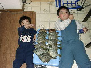 | いやー待ちにまった初釣り・初懺悔! う〜ん気持ちよか〜ぁ。 小粒アサリも自分で剥いて気合入っていたもん!(まるみさん仕入れありがとね) 昼飯も食わず頑張ったもんねー!(船の上で昼飯食うと気持ち悪くなんだよね〜) 竿もリールも今回新調したもんねー!(前回はまるみさんの借り物だったけど) 仕掛けも自分で作ったもんねー(前回は市販の使ったんだよね〜) へっへ〜、今回はおいらが竿頭だよ〜ん!(13枚だけどね) ほれ! ![]() そしてほれ! ![]() おまけでほれ! ![]() チヌそっちのけで肝に群がる落し込み部メンバ、福チヌも福キモになる日は近いかもしれない。 今回参加したメンバ 福チヌ:ひろし部長、たつちゃん、pochikoさん、まるみさん、おいら(以上落し込み) たもさん(ウキフカセ) ゲスト:エコーさん(はまかぜのかほり:管理人) | |
