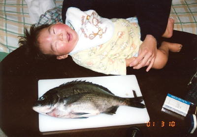 ![]() 何故か生涯初チヌの写真を持ち出して・・・みやJr.と初チヌの図 |