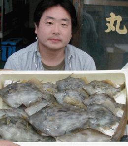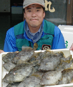それは昨年11月のことでした、我が落とし込み部の精鋭まるみ師が耳元でささやきます。「ひろしさ〜ん、肝釣りにいこうよ。」カワハギを釣りに行こうというのである。確かにバトルは決着がついてしまったことは事実。しかしながら落とし込み師として船に乗って釣るなんぞ、もっての他、来年のバトルのため精進精進!えっ、何々。まるみ師曰く「これが落とし込みの練習にもってこいっすよ。糸ふけ、聞き、誘い、全ての要素が共通してるっす。ほんで、なんてたって旨いっすよ!」確かにカワハギは旨い。なんでも肝は最も旨い時期のこと。じゃあ1回だけよ〜ん、てな具合でカワハギ釣りに行ったのが事のはじまりでした。 以来清く正しくはまってしまったオイラは、駅のホームで傘を下から上へ振りかざし(誘っちゃうのよ)、スーパーに行くと真っ先にアサリ売場に直行(いい大きさのがあったら剥きたくなっちゃうのよ)、「コッコッコッ、ギュイーン、ゴンゴン、ドピュ!」なんて寝言言ってるし(あわせが決まると昇天しちゃうのよ)、てな具合で今年もいそいそと船宿に出かける日々が続いたのでした。 おかげで落とし込みの釣果は散々、ついついあわせも聞き過ぎちゃって乗らないし、あげくに1日アタリが何度もない落とし込みを「拷問のような釣りじゃあ〜」と蔑んでしまう始末。 案の定今年も負けちゃいましたバトル。すんましぇ〜ん、落とし込み部を応援して下さるCOさん、タロさんはじめ先輩方、面目ねえ〜、って言いながら・・・・かすかに聞こえる悪魔のささやき「早いとこバトル決しちゃえば心おきなく肝行けるっすよ」(まるみ師) 前置きはこのへんにして早速本題、それは先日10月5日のことでした。空が白みはじめた5時半、我が肝部(オイオイいつから肝部になったんじゃい)の精鋭4人、まるみ師、みやちゃん、さかきさんとオイラ(とみやちゃんの義理の妹エリちゃん、一見女子高生)は佐島港つね丸さんに集合。みんないい顔してます。希望と野望に満ちあふれた顔、「今日こそ尺肝!今日こそ一家!今日こそ昇天!」やっぱ釣りはこのワクワク感から始まります。船宿の美人若女将もこっちの気持ちを察してか、いつもに増して和やかな対応。まさに癒しの空間、日頃クライアントに虐められ、女房には「働け〜」と叱咤されるビジネスマンにとってここはオアシスなのです。 和んでいる間に出船の時間が、船にはオイラたち5人の他5人の総勢10人、釣場は航程10分もかからない佐島沖亀城根。風もなく最高の凪状態、気合いも入る。いよいよ第一投目、船長の「いいよ〜」のかけ声に合わせ一斉に仕掛けを落とすやいなや、まるみ師が叫んでいます。「きたかな〜きたかな〜、叩いてる叩いてる、気持ちいい〜!」第一投目から良型。落とした瞬間に食ってきたようで、こりゃあ活性高いぞと思うやいなや、下に誘ってる間にツンツンと前アタリが、間髪入れずに竿先立てながら聞くと、「コッコッコッ」と特有のアタリ、すかさず巻きに入ると「ギュイーン」と竿を絞め込みます。オッこれは、「ゴンゴンゴン」オー叩く叩く、上がってきたのは腹パンの20cmサイズ。「いいっすね〜今日はいけるんじゃあないっすか〜!!!」まるみ師の声が弾む。そう今日は良い日にあったたようだ。 その後もポイントを変える毎に順調に釣れ、始めて2時間も経たない内にツ抜け手前、「こりゃあ20枚も夢じゃあないぞ〜」と軽口たたきながらふと隣のさかきさんを見ると・・・・顔が引きつっている。自分のことでいっぱいで気がつかなかったが、どうもまだ型を見てないようだ。この釣りは周りの釣果がやたら気になる。「なんで俺にこないの?」と考え出したら最後、どんどんペースが乱されアリ地獄にはまってしまう。まず最初の1枚が大切なのだが・・・・ 「アーッ、これはきたかも」さかきさんが叫んだ。竿を見ると叩かれているのがよく分かる、いい眺めだ。上がってきたのは22cmクラスの良型。「よかった〜!」そう、ほんとによかった。この気持ちはカワハギ船に乗った者でないと解らない。恵比寿顔のさかきさん、そう、この人は恵比寿顔がよく似合う。 「ひろしさ〜ん、アロンアルファ持ってないっすか?」の声、後ろのまるみ師だ。どうも愛用の竿SS早技のトップが抜けてしまったようだ。あいにく接着剤類は持っていない。「オイラの予備竿(バイオクラフトH)使って下せ〜」「へーい、すんません、それじゃあ」そう困ったときはお互い様。まるみ師にはいろいろお世話になっている。釣りのことから、PC、クッキング、WRC、パチスロそして五反田、曙町までこの人の守備範囲は「エリア○み」と呼ばれるほど広くそして深い。どこに行っても機関銃のような営業トークで周りを自分の空間にしてしまう。ほらまた聞こえてきた。「ひろしさ〜ん、この竿硬いっすよ〜!」何言ってるんだ、俺の竿が硬いことはよく知ってるくせに(オイオイ) そうこうしているうちに船は養殖ブイが連なって浮かぶポイントに。