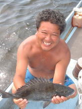 【07.01(木) 14:00 某上場企業のオフィス】 携帯に突然の電話(前もって断ってから鳴る電話は見たことない)。 『まるみしゃ〜ん、元気ぃ〜、福の神のタムラだけど、来週の月曜日予約キャンセルになったんだけど来る? 今、濁りは無いんだけど黒鯛がエサ食べるとこ見えて釣れちゃうんだよねぇ〜』 (ウゲッ、超行きたい!!最近黒鯛釣ってないしなぁ〜) 『いや〜、オイラ福浦以外じゃ釣りできないんで・・・』 (実際は仕事の予定が・・・) 『あっそう。じゃ ガチャン』 (おいおい、もうちょっと強引に誘ってよぉ〜) 【07.05(月) 12:32 某上場企業のオフィス】 携帯に突然のメール(以下同文) タイトル:『年無し4枚ゲット』 本文:昨日、福の神で二人で50オーバー4枚ゲットしました。やったぜ(^o^)丿 差出人:シン ウン?これはあのガミさん(参考:http://fukuchinu.fc2web.com/zange14.htm)と一緒に日曜に福の神に行った、シンさんからだぁ・・・ ってことは、今日行ってれば『爆』だったかぁ〜〜 (あの二人で年無し4枚ならオイラはもっと釣れる!なんて意味じゃありません。念のため) 【同 19:00 949目黒店】 テーブルを囲む怪しい4人の男たち。(決して、HB@Sのkawakenさん、やしきさんや某)落とし込み部長ではありません。念のため) 『いや〜、釣りは○○が楽しいッスよねぇ。あのカンカンカン!ってのがたまらんですよねぇ』 一同:『そうだ!そうだ!釣れない○○はつまらない!!』 (それ以外の会話が風俗問題や特定人物、団体の誹謗中傷などではなく、社会問題など一般的な話題に終始したことを付け加えておく。念のため) K:『ところで、まるみしゃん、今度の木曜に福の神丸予約してるんだけど、一緒に行く? 今回初めてだし、是非行きましょう!』 M:『いや〜、オイラ福浦以外じゃ釣りできないんで・・・』 (ちょうど仕事もその日は入ってないし、オイラもたまには釣りたい〜) 【07.06(火) 21:13 のぞみ145号車内】 携帯に突然のメール(もちろんマナーモードである) タイトル:『木曜日の件ッス』 本文:ドモ!まるみさん、超ヤバイッス!木曜日、どうしても抜けられない仕事が入ってしましました。(「しましました」です。原文どおり) 差出人:ken 【07.07(水) 15:44 のぞみ56号車内】 携帯に突然の電話(もちろんデッキでの通話である) 『まるみしゃ〜ん、元気ぃ〜、福の神のタムラだけど、明日は来ない方がいいと思うよ〜。ガミさんたちが釣った後、魚がどっか行っちゃったみたいなんだよねぇ〜、あの声の大きさで逃げちゃったかなぁ〜。ボーズの確立高いよ〜』 『いや、あの、その、kenさんは行けなくなったけど、明日は休み取ってしまったし、福浦以外で釣りはしないんだけど、黒鯛釣りたいし・・・』 『んじゃ、遠征するかも知れないんで3:00集合ってことで!』 【07.08(木) 福の神丸】 南、微風。ここでは絶好の条件。昨日とは違い濁りも入り、遠征は中止しいつもの場所での釣行となる。 ポイント手前で日の出を待ち、明るくなりかけたと同時に釣り開始。 最初のポイントは長い護岸のヘチ。約2m間隔でカニを落とす。 ヘチぎりぎりを落下速度に気をつけながら・・・ しかし、アタリは無い。エビ餌で探るタムラさんにはたまにフッコのアタリはあるが、オイラのカニは両手を広げ、元気に戻ってくる。 濁り、風ともコンディションは悪くないのだがアタリが出ない、出せない。 しばらく護岸を攻めるが当たらないため、ストラクチャーへ移動。 ここでは餌の投入とアタリの取り方、掛けてからのやり取りに相当の技術を要する。 慣れない人は投入もままならず、魚を掛けてもハリスを飛ばされて取れないことが多い。 まあ、オイラは福の神も10回目。慣れているからひょいひょいと釣るつもりが・・・ 『まるみしゃ〜ん!ダメダメ、こうやってエサ入れないと釣れないよ〜』 (判っているができない) 『ヘッタクソだなぁ〜、あわてず落ち着いて!』 (本人は落ち着いているつもりだが、結果が・・・) 『違う!違う!こうだよ〜』 (んなこと言われたって・・・) そうこうするうち、糸が吸い込まれる。待望のアタリ!ストラクチャーの中で掛ける! しかし!竿の位置が悪い。左の杭の裏で掛けたが船は右へ・・・ 腕を伸ばして耐えるが・・・・「プッチ〜〜〜ン!!」 『あ〜あ、今のはデカかったなぁ〜。そういう時は少し糸を出してやると出てくるんだけど、引っ張ったら切れるわなぁ』 『おっ、アソコに魚見えた!二匹いる。こうやるんだよ』 オイラとほぼ同じシチュエーションで見える魚を掛けたタムラさん 『こうやって、少し糸出すと・・・ほ〜ら出てきたぁ〜。オレって天才!?』 (ハイ、貴方は天才です。絶対にかないません。) と、もう一匹もタムラさんが連続ゲット!