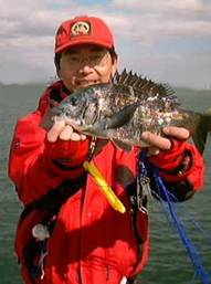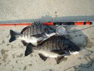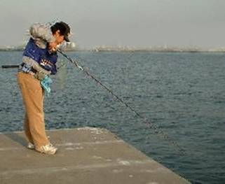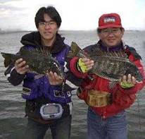 さっ、仕度の出来た方から始めてくださいね。ほら、大脇名人はあっち行きましたよ。早く行かないとみんな釣られちゃいますよ。私もちょっと拝見させていただきましょうかね。あれ?大脇名人、このロープは何ですか?ストリンガー?4投目で来た?40cmオーバー?…恐るべし大脇名人!(んで、この日、大脇さんは5回アタリあって2枚ゲット!一回は2号のハリスを飛ばされたとか…オイラ達はアタリ1回程度。この違いはなんなんだろう?)