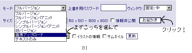 お絵かき掲示板のモードを選び。画像アップロードを選択した後お絵かきをクリック