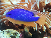 背景の水色のサンゴがキレイで気に入ってます☆ ニセネッタイスズメダイに比べると黄色っぽいです。 |