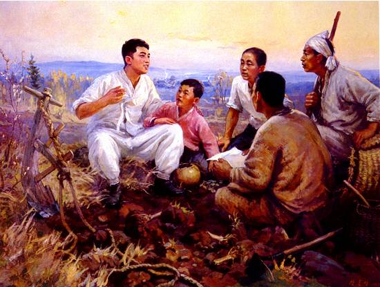 農村の革命化のため、農民の中に入って政治活動をおこなう金日成主席