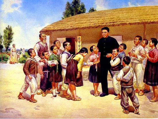 進明(チンミョン)学校の開校式の日に新入生を迎える金日成主席
